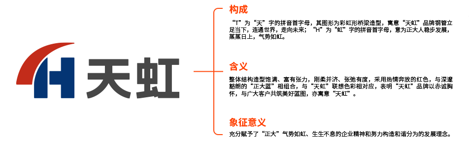 天虹品牌logo设计元素采用“T”、“H”字母造型为基本设计图形;“T”为“天”字的拼音首字母,其图形为雨后彩虹造型,集时尚、美丽、动感元素为一体;“H”为“虹”字的拼音首字母,表达了“正大人”与广大客户间兄弟相连、携手并进,共同描绘多彩未来的愿望。