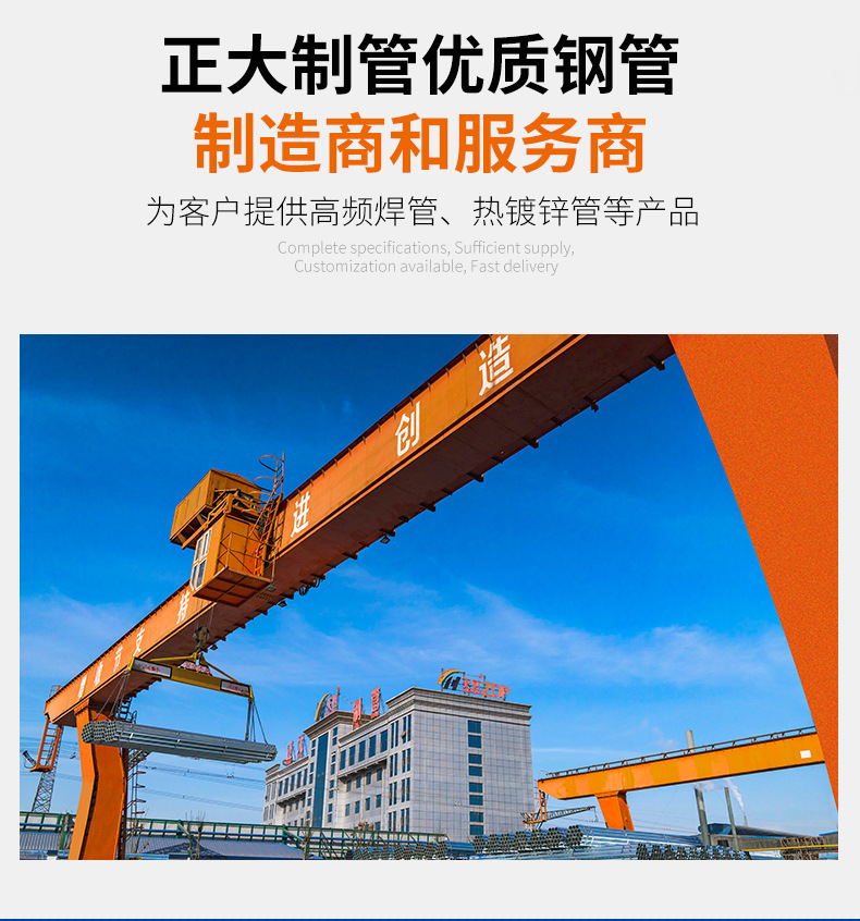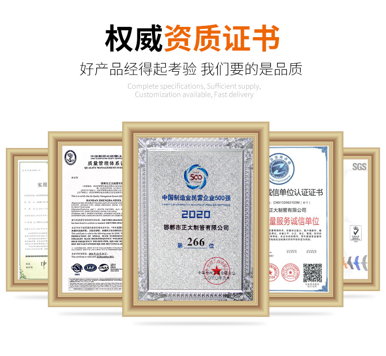 邯郸正大制管集团股份有限公司(简称:正大制管,英文缩写:ZDP)是高新技术企业、全国守合同重信用企业、两化融合管理体系贯标企业、中国制造业500强、中国民营企业500强、河北省百强企业、河北产业集群龙头企业、中国民营企业文化建设三十标杆单位等荣誉称号。是一家以高频焊管、热镀锌管、螺旋焊管、方矩管、钢塑复合管制造、销售为主导,集科、工、贸为一体的现代化综合型企业。自主品牌“天虹”荣获2014河北名片、河北省商标、河北省优质产品、河北省产品等荣誉称号。