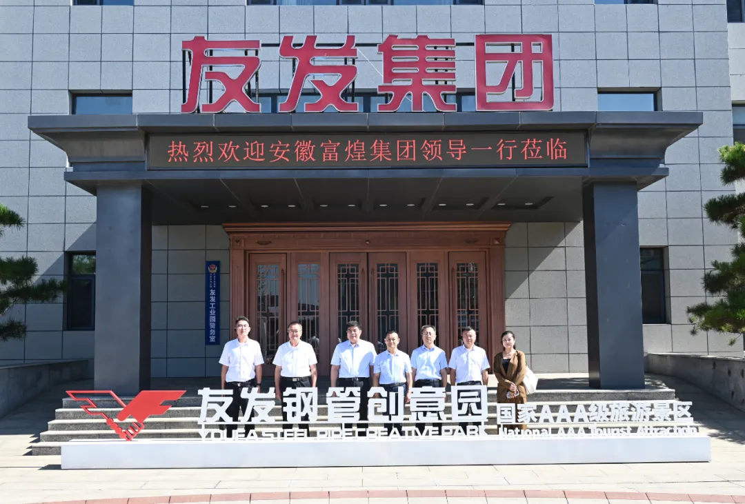 9月6日,安徽富煌集团董事长杨俊斌、党委书记刘宏、钢构股份公司总裁郑茂荣、钢构股份公司江苏事业部总监崔媛一行莅临友发集团走访交流。友发集团董事长李茂津、党委书记金东虎、友发德众常务副总经理丁秀臣、钢结构产业研究院首席执行官兼江苏友发销售总监袁磊热情接待,双方围绕深化合作、共促行业发展展开深入交流。